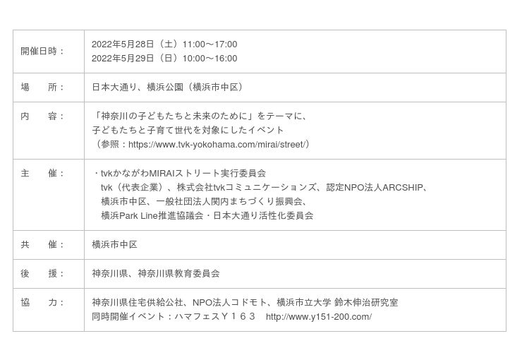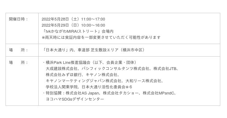 本実証は、株式会社テレビ神奈川(以下、tvk)を代表とするtvkかながわMIRAIストリート実行委員会が主催するイベント「tvk かながわMIRAIストリート※2」を通して、国土交通省創設の歩行者利便増進道路制度※3(通称「ほこみち」)に基づいてYPLが提言している「道路空間の広場化」に取り組むものであり、周辺にお住まいの方々や来街者の皆様に当該空間を体験していただき、その有用性を確認するものです。