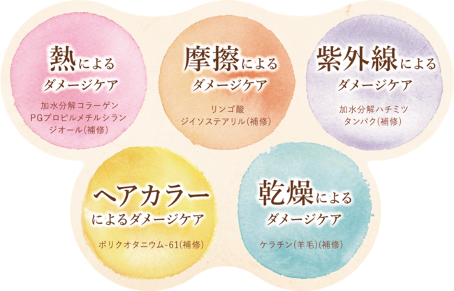 様々な外的要因によってダメージを受けた髪を補修する「5Dリペア処方」を導入しました。熱・摩擦・紫外線・ヘアカラー・乾燥による5つのダメージを受けた髪を補修し、毛先までうるおう超しっとりした髪へと導きます。
