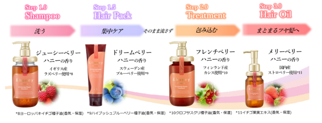 シャンプーはイギリス産ラズベリーを使用したジューシーベリーハニー、ヘアパックはスウェーデン産ブルーベリーを使用したドリームベリーハニー、トリートメントはフィンランド産カシスを使用したフレンチベリーハニー、ヘアオイルは国内産ストロベリーを使用したメリーベリーハニーの香りを採用し、 4種のベリーハニーの香りに仕上げました。