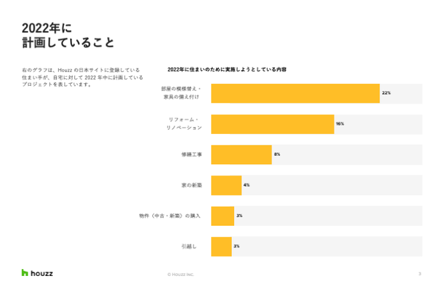 また、2022年も引き続き、22%が部屋の模様替えや家具の備え付けを、16%がリフォーム・リノベーションを計画しています。