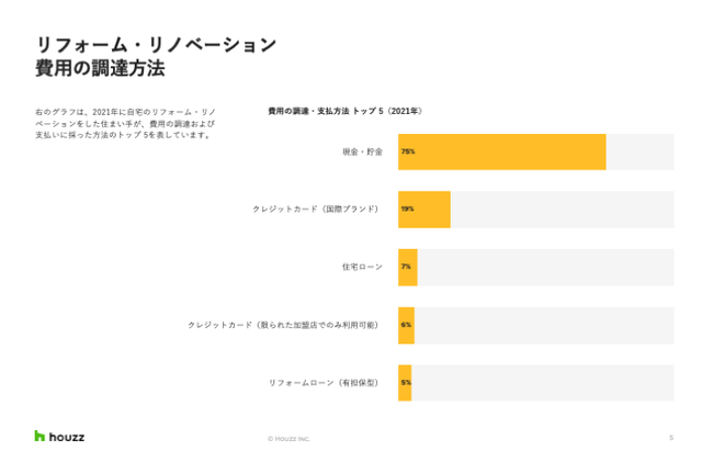 Houzz エコノミストのマリーン・サルグシャンは、「サプライチェーンの混乱によって製品や材料のコストが上昇しているにもかかわらず、住宅所有者は住まいへの投資に積極的であり、これまでとは異なった資金源を模索していることが明らかになりました」とコメントしています。