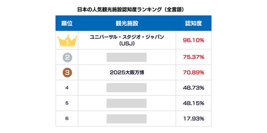 さらに今回の調査では、万博の認知度が訪日観光客の中でどのような位置づけにあるのかを把握するため、ユニバーサル・スタジオ・ジャパン(USJ)をはじめ、ジブリパーク、ハウステンボス、富士急ハイランド、そして今後の開業が注目されるジャングリアといった、日本の主要観光施設との比較を行いました。