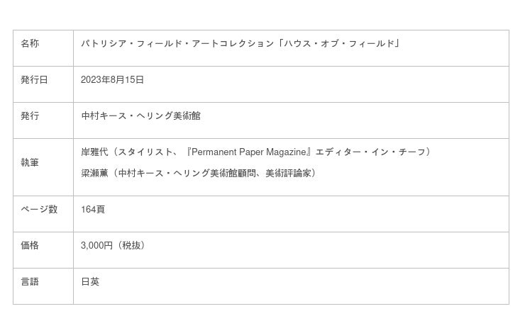 本展の開催を記念して、パトリシア・フィールドが半世紀をかけ て蒐集した作品群から約140点を紹介するコレクションカタログを刊行します。ブティックでも異彩を放っていたコレクションの核となるペイン ティングや彫刻作品はもちろん、本展に展示されない作品も図版と して掲載するほか、アートコレクションの成り立ちを紐解くパトリ シア・フィールドへのインタビュー、彼女と親交の深い執筆陣によ るエッセイを収録。パトリシア・フィールドと彼女を取り巻く個性豊かなコミュニテ ィ「ハウス・オブ・フィールド」と彼らが作り出す作品を総覧する 一冊です。