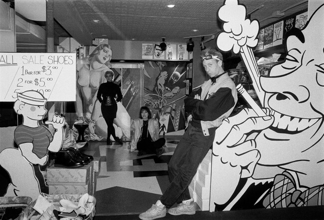 本展では、ネオンサインやマネキンなどブティック で使用されていた小道具を用いたインスタレーションで、個性豊かなハウス・オブ・フィールドの人々とアートで溢れたブティックの雰囲気を再現します。展示室では、ダウンタウンのクラブやアートシーンを記録したビデオグラファー、ネルソン・サリバンによる1980年代中期のブティック「パトリシア・フィー ルド」の映像を常時放映し、パトリシア・フィールドやブティックのスタッフ、買い物客らの会話が響く中で作品をご覧いただきます。