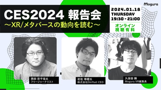 本セミナーでは、現地を取材予定のMogura VR編集長の久保田、そしてジャーナリストの西田宗千佳氏、現地に出展社としても参加されたShiftallの岩佐氏、をゲストに迎え、現地で目撃した様々な技術やデバイス、出展社の全体動向、そして2024年のXR/メタバースの展望を語ります。