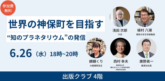 東京文化資源会議(会長:吉見俊哉)は、2024年6月26日(水)午後6時~8時に、日本出版クラブ(東京都千代田区神田神保町1-32)にて、シンポジウム「世界の神保町をめざす “知のプラネタリウム“の発信」を開催します。