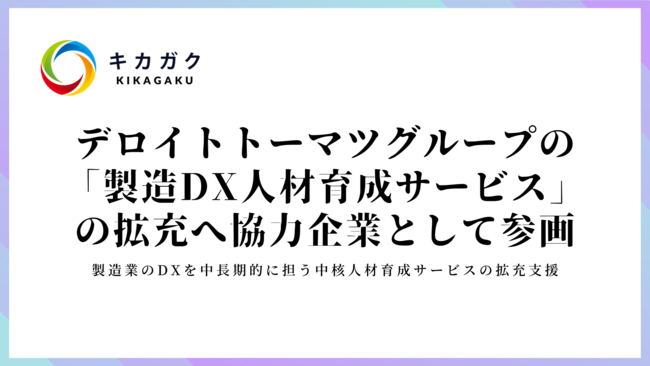 人工知能 (AI) 領域を含めた先端技術に関する人材育成を通し DX 推進を支援している株式会社キカガク(本社:東京都渋谷区、代表取締役社長 大崎 将寛、以下キカガク)は、デロイト トーマツ グループ(東京都千代田区、グループCEO:木村 研一)が提供を開始した、製造業のデジタル導入による業務変革を支援する「製造 DX 人材育成サービス」の拡充とコンテンツ開発に協力企業として参画することをお知らせします。