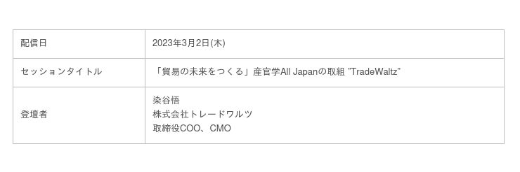本セッションでは、取締役COO、CMOの染谷氏から、TradeWaltzのサービス紹介に加えて、今後の貿易プラットフォームが描くビジョンも含めて語って頂きます。