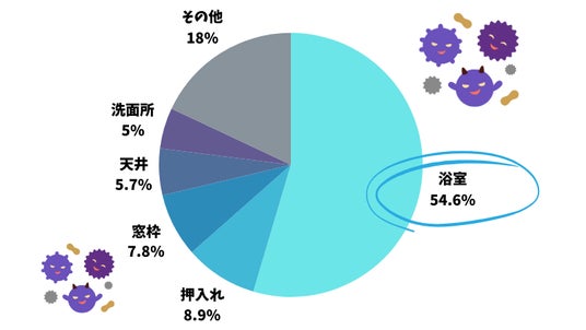 「最悪だったカビの発生場所」を聞いたところ、ダントツの1位は「浴室」(54.6%)でした。やはり水回りの代表格である浴室は、湿気や温度の条件が整いやすく、カビが発生しやすいスポットとなっているようです。