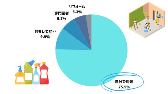 調査結果によると、カビへの対処法として最も多かったのは「自分で対処した(75.5%)」。「とりあえず市販のカビ取り剤で対応する」という人が圧倒的でした。一方で、「何もしていない(9.9%)」「専門業者を呼んだ(6.7%)」「リフォームした(5.3%)」といった声もあり、対処の方法は被害の深刻度によって分かれていることがわかりました。
