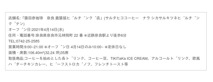 猿田彦珈琲株式会社(本社:渋谷区/代表取締役:大塚朝之)は、2021年4月14日(水)、奈良県に「猿田彦珈琲 奈良 鹿猿狐ビルヂング店」をオープンいたします。