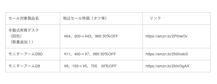 2019年12月8日0:00~12月9日23:59にわたって開催されるAmazon「サイバーマンデー」において、人気のFlexispot電動昇降デスク、Loctekモニターアームなど製品を最大30%OFFにて販売いたします。一部商品が高評につき、数量追加決定!