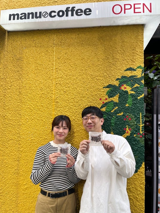 manucoffee roasters クジラ店 左から浴永 晴香様、中澤 豪助様〈社長 福田 雅守様、中澤 豪助様、浴永 晴香様からのメッセージ〉薬院のクジラ店で焙煎したクジラブレンドをバリスタが丁寧に抽出したエスプレッソを使用しており、エスプレッソの甘さ・質感・風味と、コーヒー感が金平糖の甘さが混ざり合います。コーヒー感をより感じられるよう、少し大きめサイズにしています。