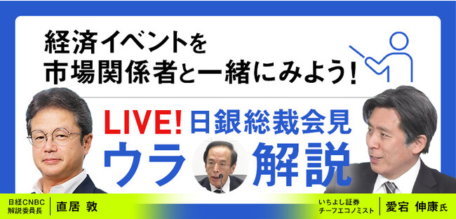日本銀行は6月15~16日に植田和男総裁のもとで金融政策決定会合を開きます。番組では、16日の決定会合開催後に行われる植田総裁の会見を見ながら、日銀ウォッチャーの愛宕伸康氏(いちよし証券 チーフエコノミスト)と日経CNBC解説委員長の直居敦が、植田総裁の発言をはじめ、記者が総裁に投げかける質問の意図などをZoom上のチャットでライブ解説します。日経CNBC online会員だけが視聴できる限定コンテンツとなります。