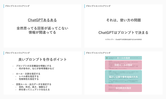 本セミナーにて、要件定義、評価基準作成、面接質問の作成、求人票作成、スカウト文作成、候補者対応、採用PR記事の作成など、幅広い採用業務にChatGPTを活用する方法を紹介するほか、導入の際の注意点や、活用にあたって必要なスキルについても詳しくご案内しました。
