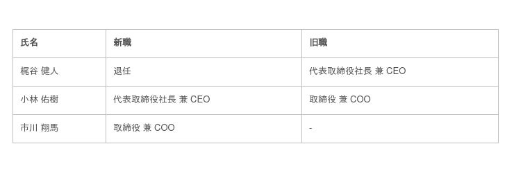 創業者である梶谷は代表取締役社長 兼 CEOとして事業拡大を牽引してきましたが、このたび本人の健康上の理由により当職を退任する運びとなりました。