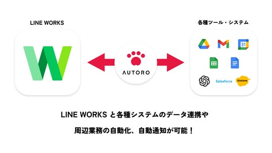 パソコン上の業務を自動化するWeb Auto Robot「AUTORO」を提供するオートロ株式会社(本社:東京都中央区、 代表取締役:福田志郎、 以下当社)は、この度、LINE WORKS株式会社(本社:東京都渋谷区、代表取締役社長:増田 隆一)が提供するビジネス現場のコミュニケーションツール「LINE WORKS」とのAPI連携機能をリリースいたしました。