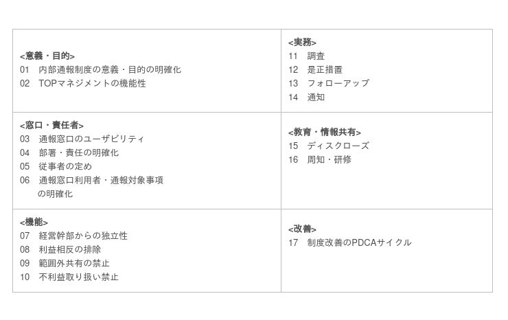 本サービスの評価・点検は、内部通報規程や、受付・調査などの組織体制、データの保管設備など法が求める要件を形式的に満たしているかを評価・点検する「形式的評価」と、実際の運用場面において内部通報システムが正しく機能しているかを評価・点検する「実効性評価」の二面評価を行います。評価・点検項目は以下の6つの分類と17の大項目で構成されます。