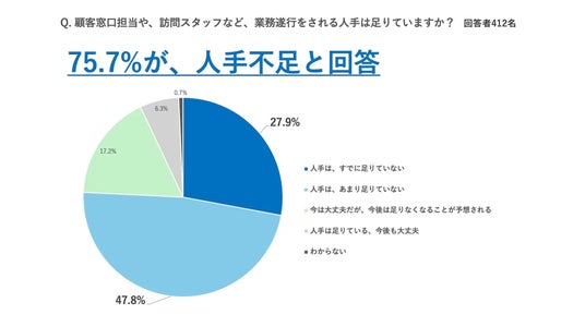 フィールドサービス産業に従事される方を対象に、インターネット調査をした結果、75%以上の方が現時点でも「人手不足である」と回答されました。また、日々業務遂行される中で、困っていることや課題について質問した結果、「人の頭で最適な日時やスタッフを割り当てることが限界」と答えた方は、50%近くいることが分かりました。