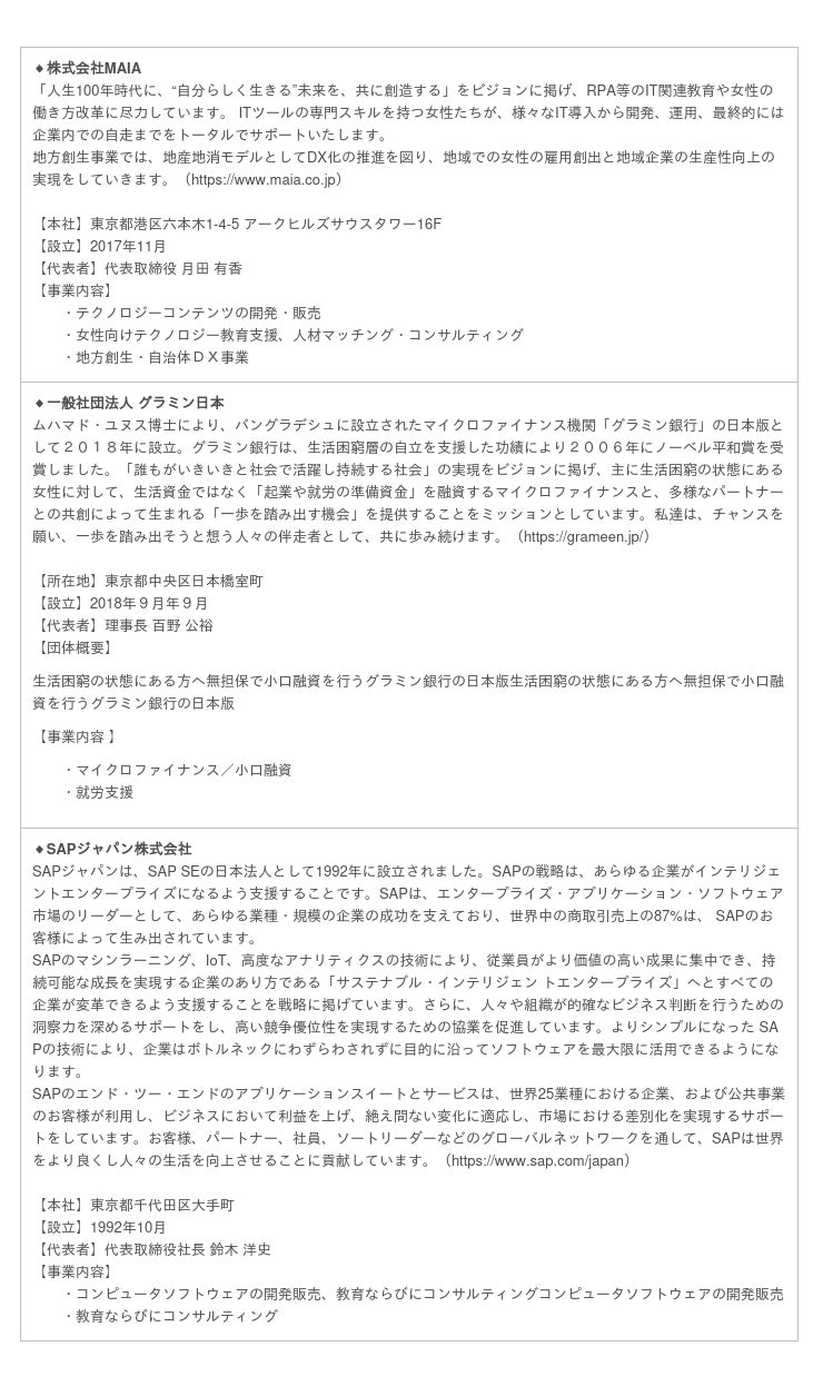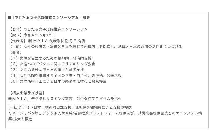株式会社MAIA(本社:東京都港区、代表取締役:月田 有香、以下「MAIA」)と一般社団法人グラミン日本(所在地:東京都中央区、理事長:百野 公裕、以下「グラミン日本」)、SAPジャパン株式会社(本社:東京都千代田区、代表取締役社長:鈴木 洋史、以下「SAPジャパン」)の3社で構成する「でじたる女子活躍推進コンソーシアム」は、本日9月28日に、鹿児島市(市長:下鶴 隆央)と実証事業「かごしまデジタル女性(おごじょ)プロジェクト」に関し連携協定を締結しましたのでお知らせします。