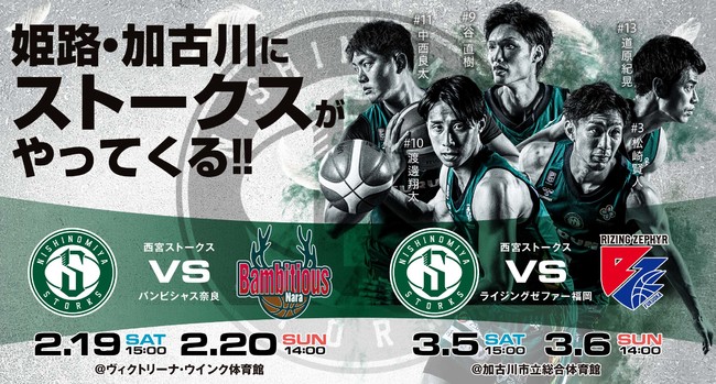 プロバスケットボールリーグ(Bリーグ)2部に所属する西宮ストークス(兵庫県西宮市/2月7日時点:西地区3位)は、3月5日(土)、6日(日)の2日間で、加古川市立総合体育館で開催される公式戦「西宮ストークス vs ライジングゼファー福岡」のチケットを、本日から発売いたします。2月7日(月)から10日(木)がファンクラブ会員先行発売となり、2月11日(金)より一般発売がスタートします。Bリーグチケットとローソンチケットから購入可能です。また、加古川市を含む、東播・西播エリアに在住・在学の方はお得に観戦できる『特別優待企画』をご用意しております。