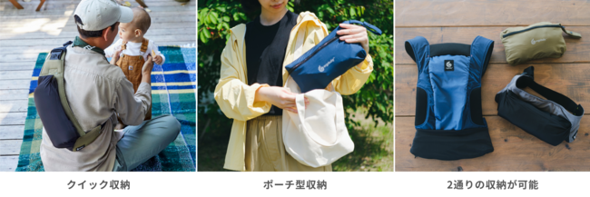 ウエストベルト部分のカバーやポーチで、2通りの収納が可能。お子さまを短時間だけ降ろす場合は、ボディバッグのように抱っこひもを腰や肩に身に着けられる「クイック収納」、ベビーカーや車移動がメインのお出かけ時に念のため携帯しておきたい場合には「ポーチ型収納」と使い分けができます。