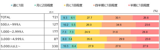 「勤めている会社で1on1を導入している」と回答した上記の765名のうち、実際に自身が1on1を実施しているのは721名(64.1%)となり、1on1の実施頻度は図2のようになりました。