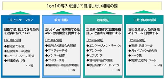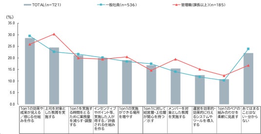 (考察)「上司を対象とした教育を実施する」については、1on1をさらによい時間にしようという管理職の前向きな思いが見られ、また、「メンバーを対象とした教育を実施する」は、現状では1on1にあまり意義や効果を感じていない一般社員の状況を改善したい、という思いを持った管理職が存在すると想定されます。