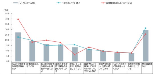 課題については、「1on1を実施する時間が取れない」が管理職の回答率が高く、「実施している意味、効果が感じられない」は管理職に比べて一般社員の回答率の高さが目立ちました。