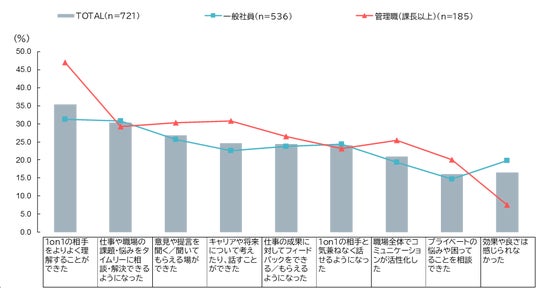 良かったことや効果としては、「1on1の相手をよりよく理解することができた」「仕事や職場の課題・悩みをタイムリーに相談・解決できるようになった」が上位になりました。