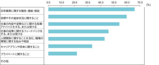 「日常業務に関する報告・連絡・相談」や「目標やその進捗状況に関すること」などが上位にランクインし、日々の業務報告や進捗管理のウェイトが大きいことが分かりました。