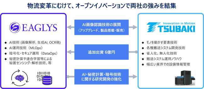 EAGLYS株式会社(本社:東京都渋谷区、代表取締役社長:今林広樹、以下EAGLYS)と、株式会社椿本チエイン(本社:大阪市北区、代表取締役社長:木村隆利、以下椿本チエイン)は、オープンイノベーションにより開発した「AI画像認識技術」の実用化に取り組んでいます。今回、椿本チエインはEAGLYSの第三者割当増資を引き受け、2021年2月の出資に続く追加資本提携を実施しました。両社の技術・知見を結集し、物流変革に向けた「AI画像認識技術」のアップグレード、販売を加速していきます。