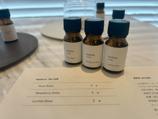 今回のワークショップでの調香に当たっては、調香師の堀田が事前にマカロンを食し、イメージし、様々なインスピレーションから試作を重ね完成しました。