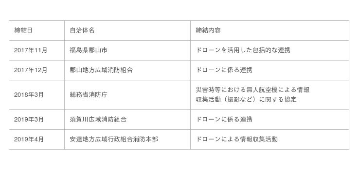 2017年11月に福島県郡山市とドローンの普及や人材育成、ドローンを活用した復興・災害支援に関する協定を締結しました。12月には郡山地方広域消防組合、2018年3月には全国の68事業所にも選定され災害の被害調査などの活用を視野に総務省消防庁と「災害時等における無人航空機による情報収集活動(撮影など)に関する協定」を締結。