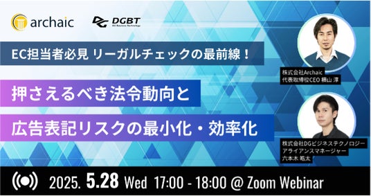 生成AIによる法規制対応ソリューションを開発・提供する株式会社Archaic(本社:東京都、代表取締役:横山 淳)は、デジタルガレージグループの株式会社DGビジネステクノロジー(以下、DGBT)と共に、2025年5月28日(水)に無料オンラインセミナー『【EC担当者必見】リーガルチェックの最前線! 押さえるべき法令動向と広告表記リスクの最小化・効率化』を開催いたします。