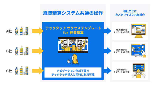 このたびの「テックタッチサクセステンプレート for 経費精算」は、経費精算システム利用の際に、システム活用の支援をする「テックタッチ」のリアルタイムナビゲーションをテンプレート化したものです。本テンプレートの利用により、経費精算システム上のほとんどのユーザーに共通する操作画面のナビゲーションについて、お客様自身による設定が不要になります。そのため「テックタッチ」導入後すぐに、効果的なナビゲーションをご利用いただけます※1。