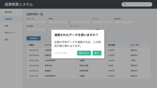 様々なWebシステムにノーコードでナビゲーションを設置可能なSaaS「テックタッチ」(https://techtouch.jp/)を開発・提供するテックタッチ株式会社(本社:東京都千代田区、代表取締役社長:井無田仲、以下、当社)は4月5日、経費精算システムを、マニュアルレスで使いやすくする「テックタッチサクセステンプレート for 経費精算」の提供を開始したことをお知らせいたします。