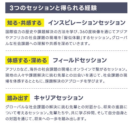 クロスブリッジは全国の高校生がオンラインで国際的な社会課題と接点を持ち、その解決に取り組む先輩との出会いから、自身のキャリアの可能性を広げていくものです。今年は日本全国から30名を募集し、8月から10月まで実施します。参加費は無料です。今期はこれまでも参加者から好評だった「メンタリングセッション」の内容をさらに充実させるなどのアップデートを行い、幅広い層の高校生に対してグローバルな視座で探究学習に触れ、そして自身の関心を深める機会を提供します。(募集要項は本リリース後半をご覧ください)
