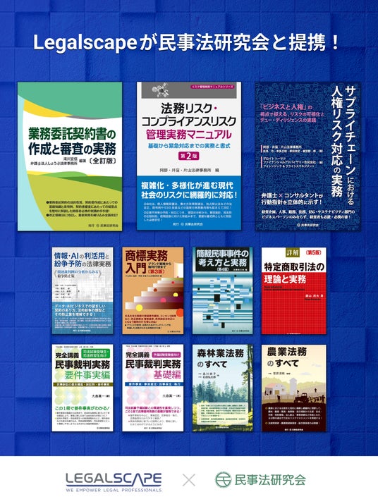 株式会社Legalscape(本社:東京都文京区、代表取締役社長・最高経営責任者:八木田 樹、以下リーガルスケープ)は、株式会社民事法研究会(本社:東京都渋谷区、代表取締役社長:武石 陽一)と新たに提携し、書籍の掲載を開始したことをお知らせします。