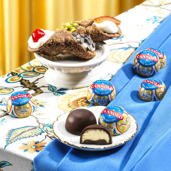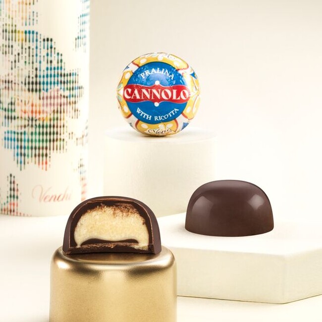 ヴェンキのイタリアンデザートコレクションは、ティラミスやパンナコッタ、バッチョ ディ ダーマなど世界中で愛されるイタリアンデザートのレシピを再構築して1粒のチョコレートで表現したシリーズ。最新作となる「カンノーロ」は、クリーミーなリコッタのフィリング、砂糖漬けのチェリーとオレンジが入ったサクサクのグルテンフリーのビスコッティ、そのすべてを濃厚なダークチョコレートで包み、シチリアの美味しいデザート「カンノーロ」を表現しました。