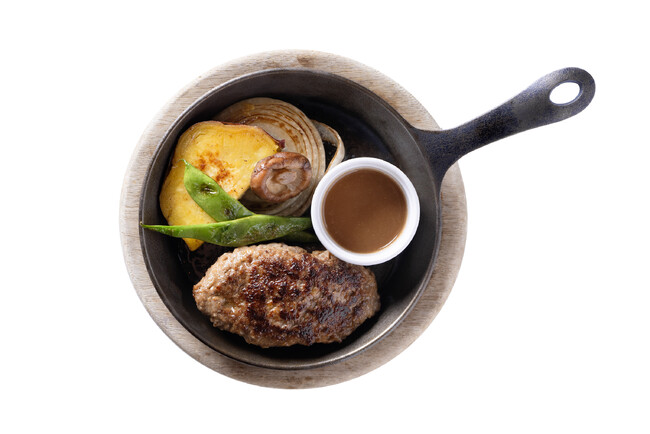 数種類の牛肉を独自にブレンドし、肉汁が溢れ、お肉本来の味を楽しめるハンバーグに作り上げました。ハンバーグはソース無しでも美味しいのでお子様はそのままで、大人は是非付属の濃厚なオニオンソースと一緒にお召し上がりいただけるので世代問わず一緒にお楽しみいただけます。