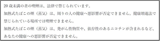 BATグループでは、たばこ製品のマーケティングを適切に実施するために国際的な自主規準を設定しています。そのため消費者に対するたばこ製品に関するすべてのコミュニケーションには、20歳未満の方へのコミュニケーションをお控えいただくとともに、「喫煙と健康に関する注意文言」を表示することを関係各位にお願いをしております。加熱式たばこに関しては、記事掲載していただく際には、「健康に関する注意文言」が表示されるようご配慮いただきたく存じます。 ご協力の程、何卒よろしくお願い申し上げます。