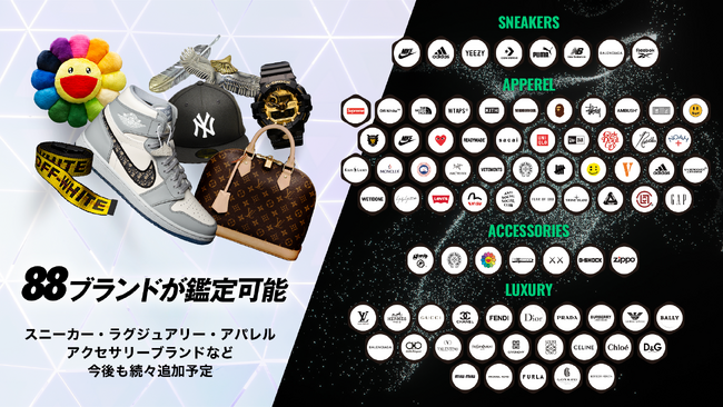 現在、スニーカーブランドをはじめ、アパレル、アクセサリー、ラグジュアリーブランドなど約88のブランドを鑑定することができます。今後も対応ブランドを追加してまいります。