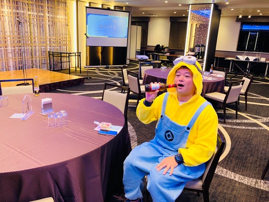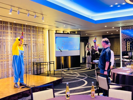 開幕早々、社長の橋本が人気キャラクターの衣装に身を包みサプライズ登場しました。会場は笑いと拍手に包まれ、イベントのテーマである「楽しむ心」を体現するスタートとなりました。社長のユーモアあふれる登場により、緊張がほぐれ、会場全体が笑顔に包まれました。