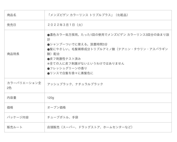 「メンズビゲン」から「メンズビゲン カラーリンス+++」を発売することで、ユーザーの不満対応、生活者のニーズに対応し、男性白髪用ヘアカラー市場のさらなる活性化を図ってまいります。