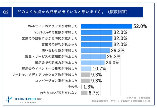 Q1で「非常にそう思う」「ややそう思う」と回答した方に、「Q2.どのような点から成果が出ていると思いますか。(複数回答)」(n=75)と質問したところ、「Webサイトのアクセスが増加した」が52.0%という回答となりました。