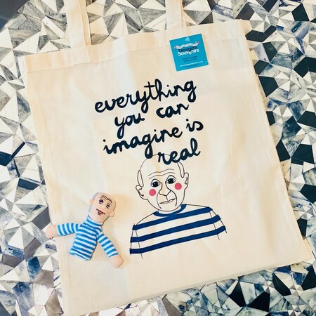 当館のミュージアムショップでは、ボーダーシャツを着たピカソのデザイングッズもございます。ミュージアムショップだけでもご利用可能です。