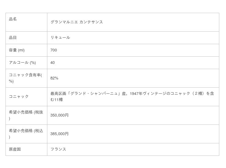 カンテサンスは、マルニエ・ラポストール家のセラーに保存されている、最長で70年熟成の厳選された11樽のコニャックと、最高区画「グランド・シャンパーニュ」産の葡萄を使用したスペシャルキュヴェです。