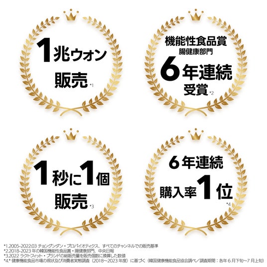 ラクトフィットは、6年連続で「韓国機能性食品賞・腸健康部門」*²を受賞しており、その機能性と品質の高さが評価されています。また、1秒に1個が売れる*³という驚異的な販売実績を記録し、6年連続で消費者購入率No.1*⁴を維持するなど、韓国の健康機能食品市場を牽引する存在です。