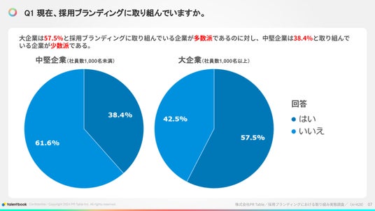1. 大企業の57.5%が採用ブランディングに取り組んでいるのに対し、中堅企業は38.4%と少数派である